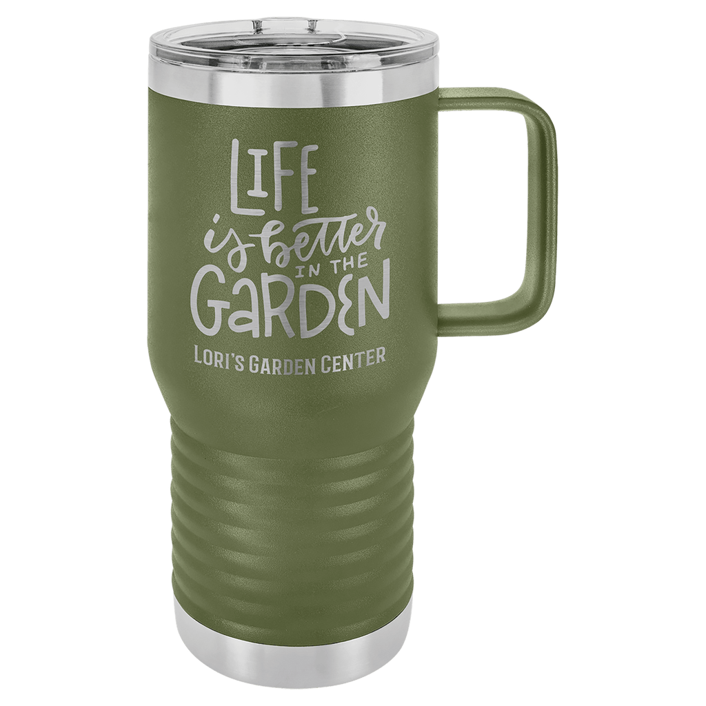 This 20 oz. tumbler measures 7-7/8" tall x 3-14" wide and comes in 18 vibrant powder-coated colors to cover everyone's taste!