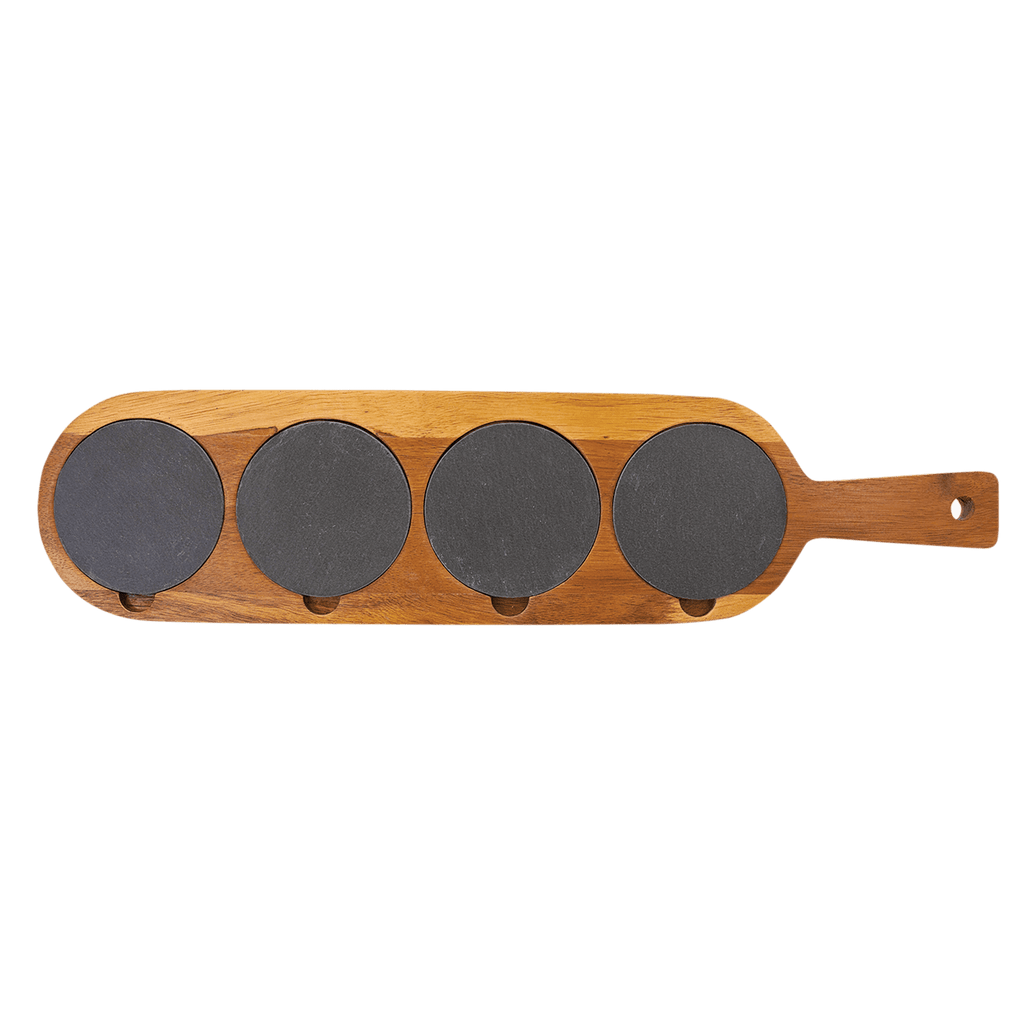 Host your favorite guests and beer enthusiasts in style with this personalized acacia wood serving board. Featuring a handle and detachable slate coasters, this board is perfect for housewarming gifts, weddings, and any occasion. Add a touch of sophistication to your kitchen with this unique and useful entertaining piece.