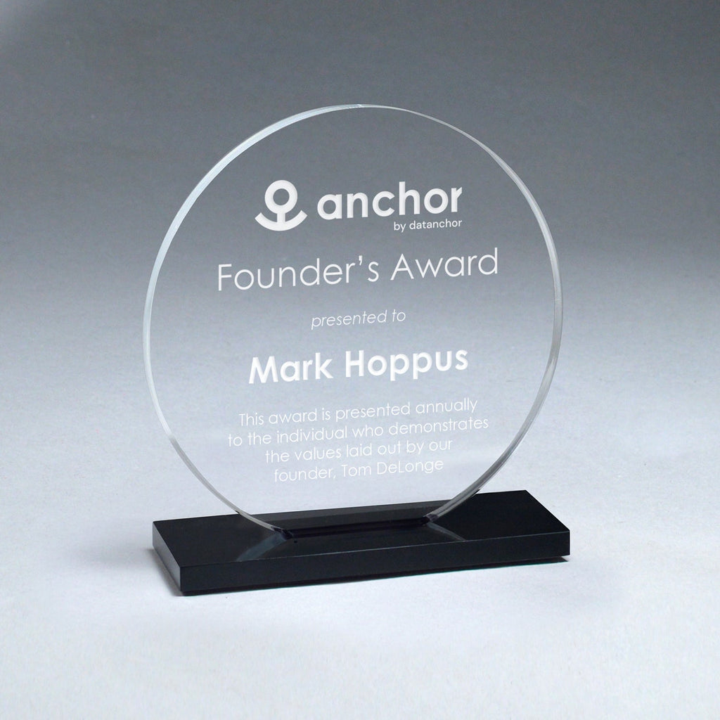 This Clear Acrylic Starfire Circle design with an ebony acrylic base is contemporary and eye-catching with its precision-cut frosted lasered personalization. Logos easily incorporated and we can also UV print in color to enhance this popular award even more!