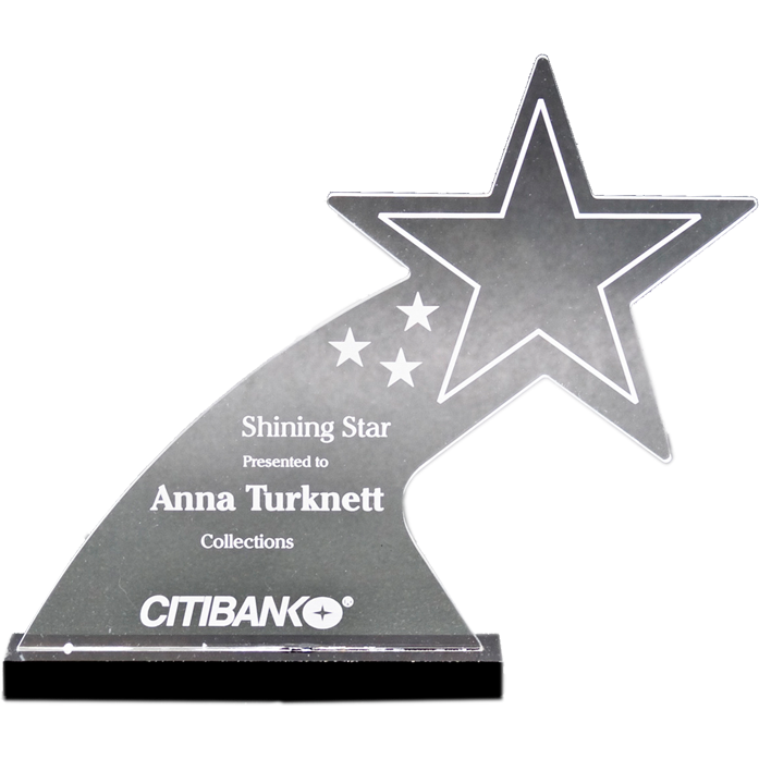 Starfire Acrylic Award - Shooting Star-shaped design. This Clear Acrylic design with an ebony acrylic base is contemporary and eye-catching with its precision-cut frosted lasered personalization. Logos easily incorporated.