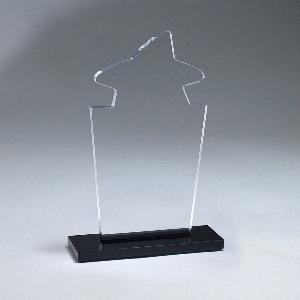 The clear acrylic design is lasered in intricate detail and personalized or can be color imprinted for an additional fee. Award comes with a contemporary slotted base and is available in two sizes.