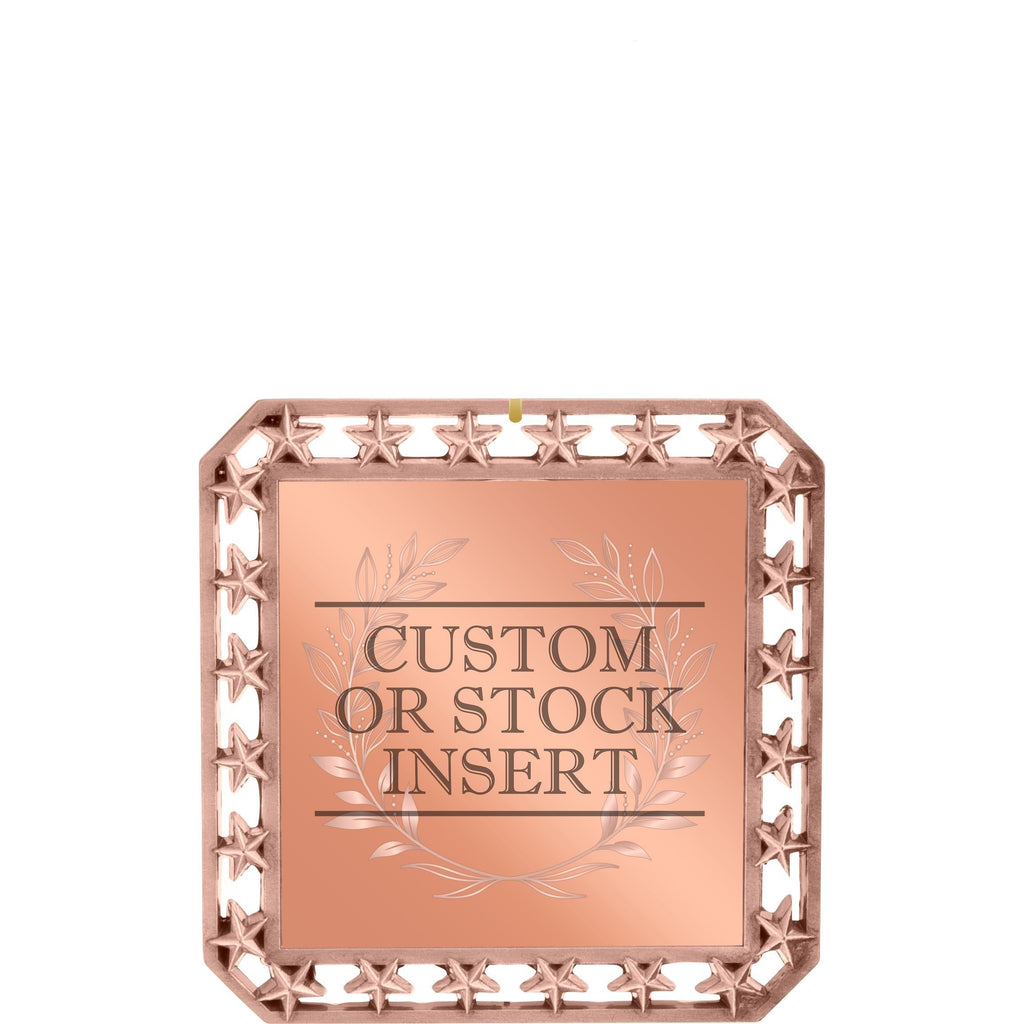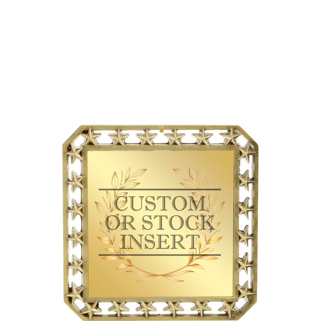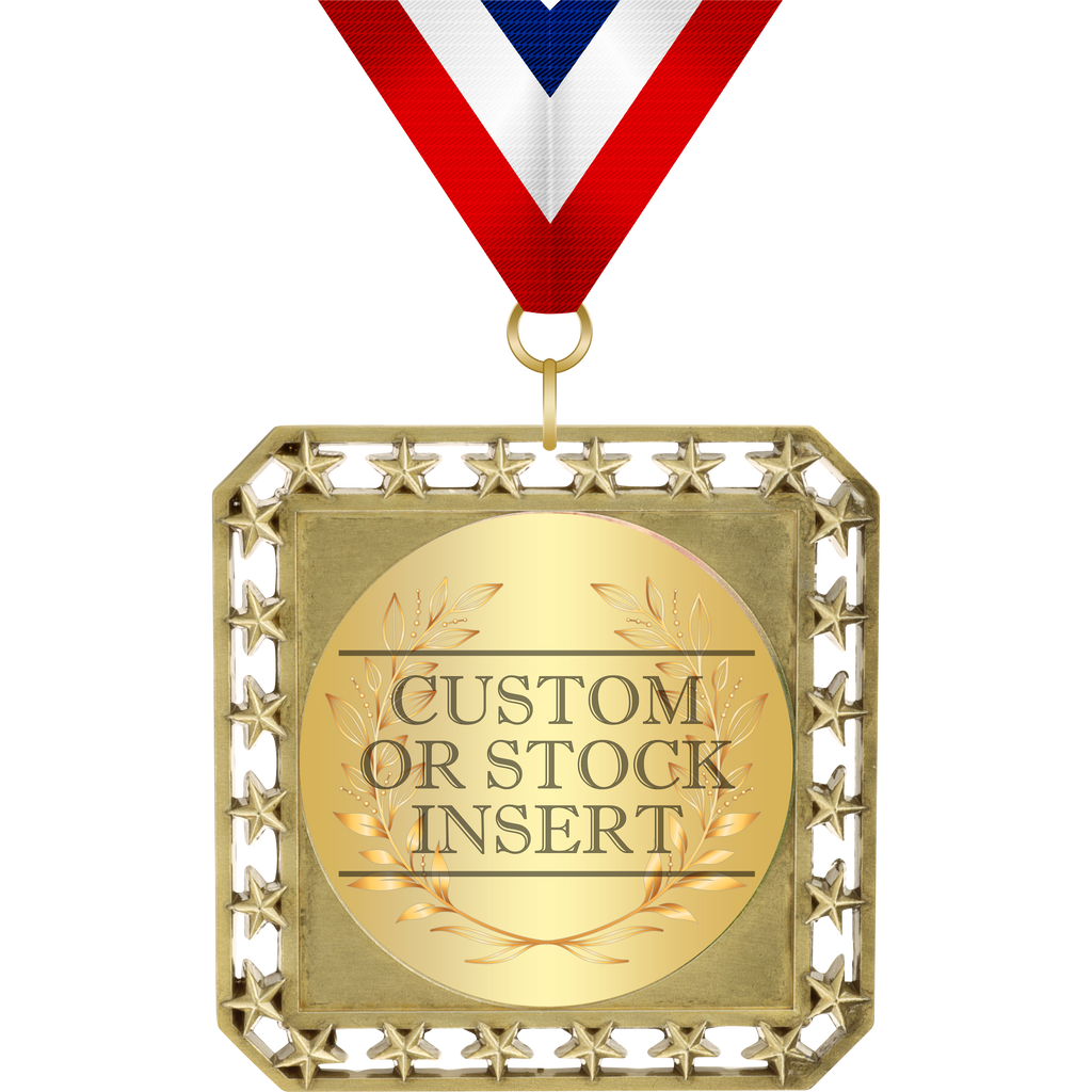 This 3.5" medals is available in Gold, Silver or Bronze. Shown with a 2" round insert. Select from a multitude of contemporary and colorful activity Mylar inserts.