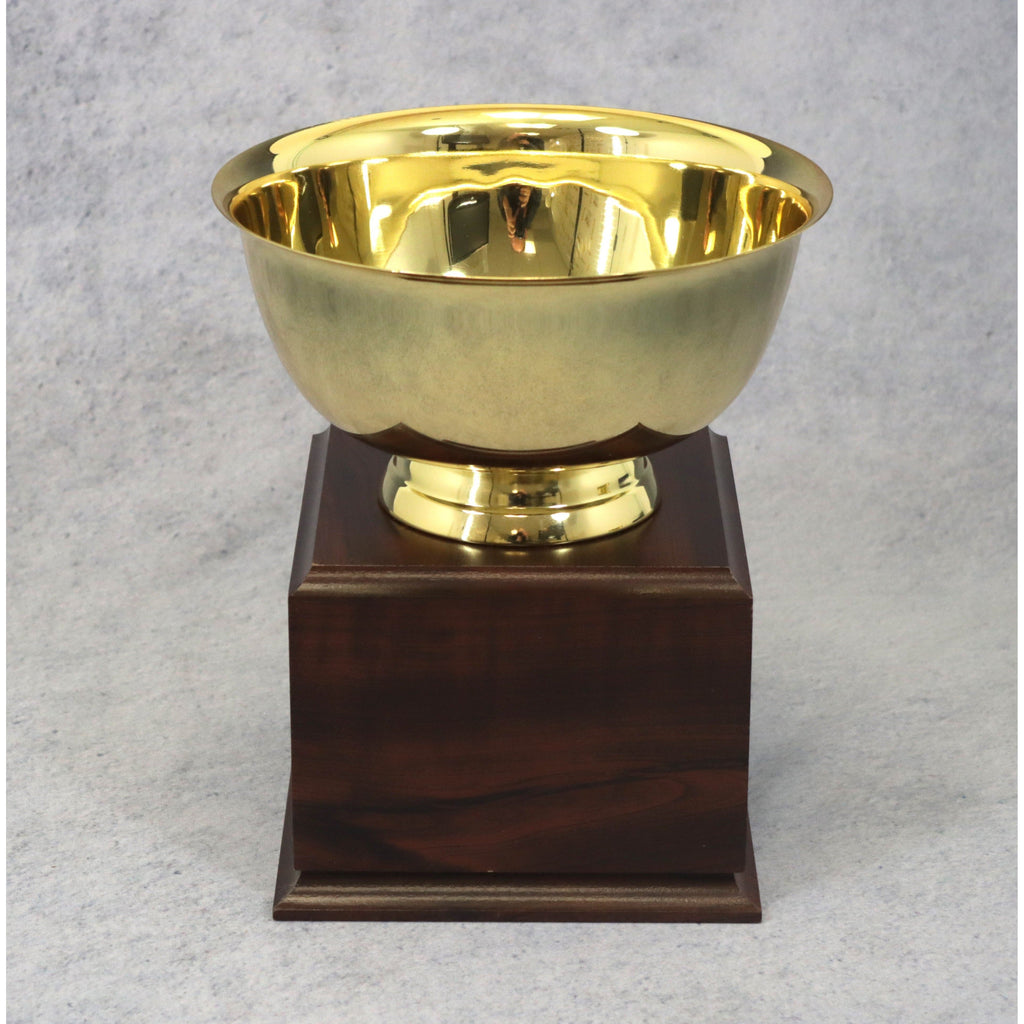 Available in 5 sizes, this elegant Gold Revere Bowl adds a rich touch on our walnut finish base with a personalized plate. This classic award is perfect for annual events as a perpetual award. Its timeless design adds elegance to any occasion. The plate can be personalized with your logo and a special message for the recipient. The bowl can be engraved for an extra charge if needed.