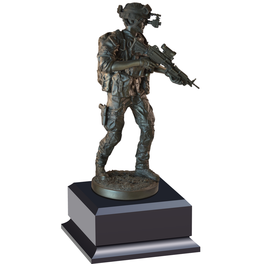 Show your military pride with the awe-inspiring Night Mission Soldier Statue. Crafted from antique resin, this 12.5" tall detailed statue makes a bold statement in any room. This statue stands proudly on an ebony base with a gold plate for recognition of our oustanding service members.