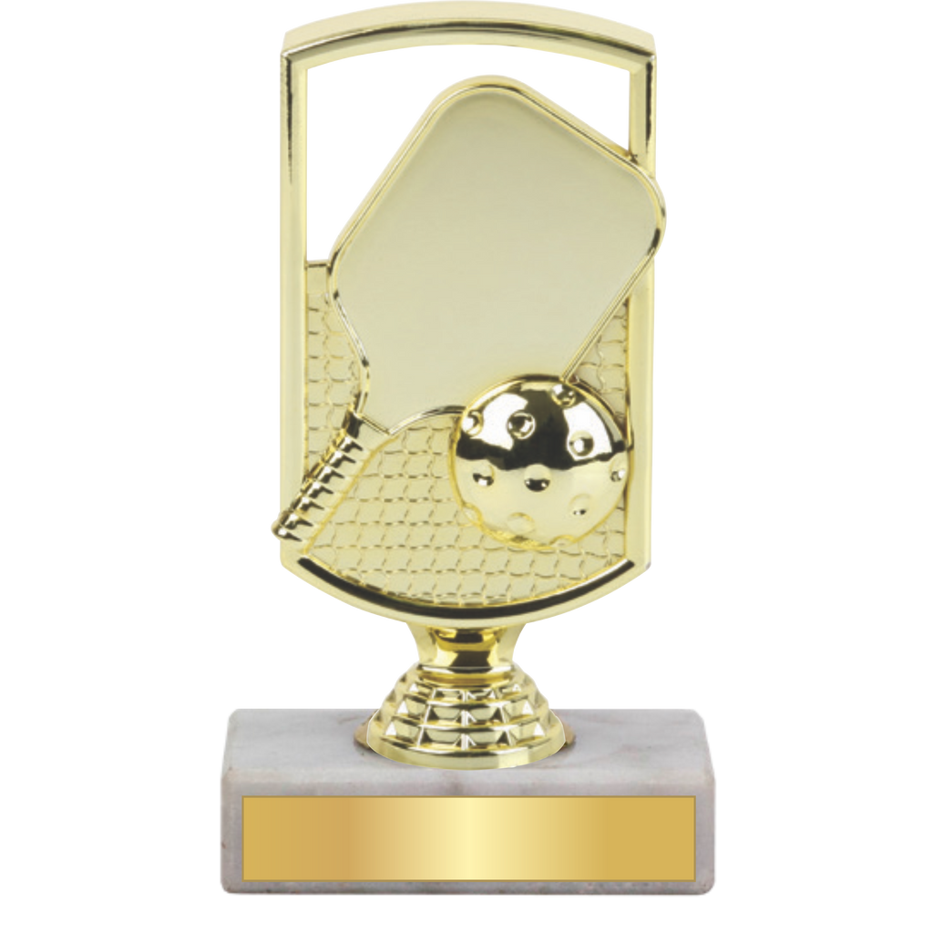 Get ready to pickle up your game with this golden Pickleball Trophy! Featuring a dynamic figure that embodies all of the elements of the sport, this trophy is the perfect reward for any Pickleball event. The attached plate can be personalized for any event. Serve up some smiles and get your hands on this trophy now!
