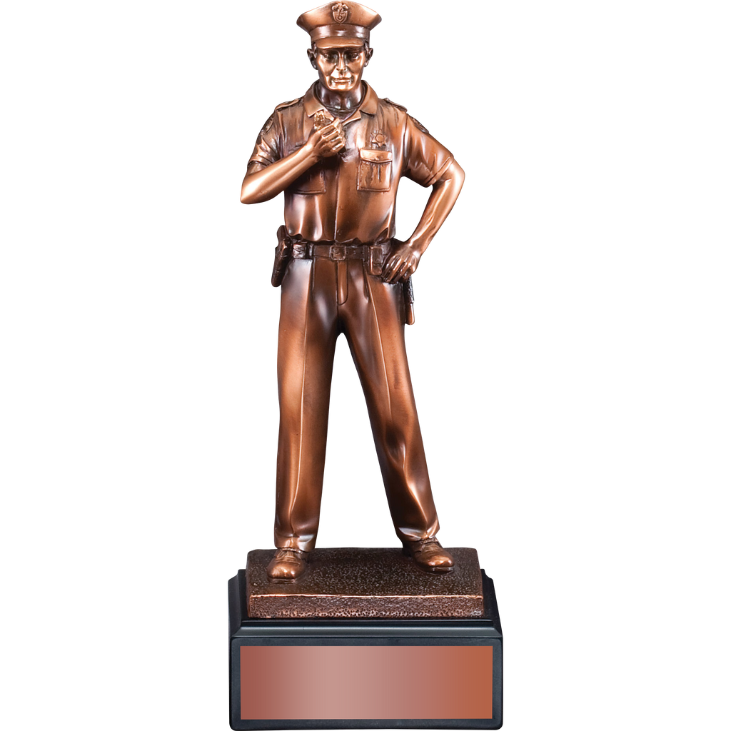 Honor the Men in Blue First Responders with this 11.5" Bronze-tone Policeman Statue. Proudly display this beefy piece in your home or community to show support and recognition for today's heroes in service. Personalize the plate with your message to honor an outstanding individual on the force or a retired member.
