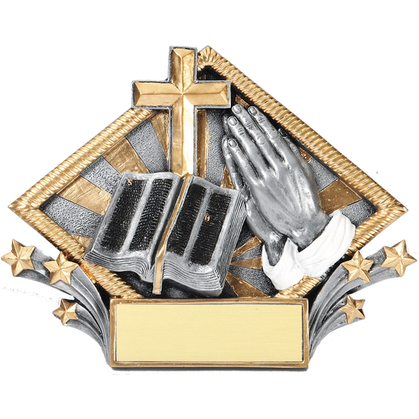 3D silverstone religion them resin with gold accents. This 6" high resin can either hang on wall or stand upright. Lettered plate can be attached to the resin.Â