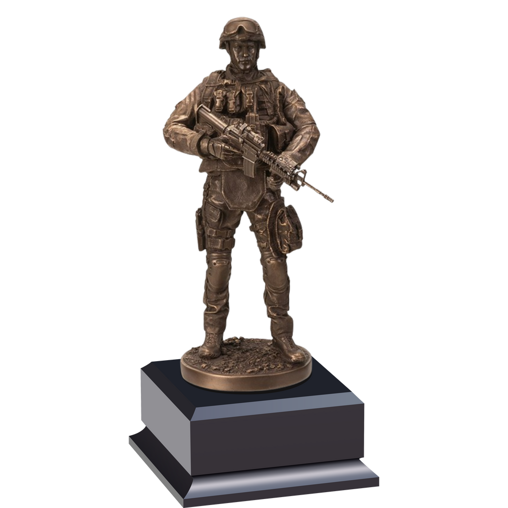 Honor and recognize the brave with this Soldier on Duty Statue. It features a military figure standing atop an ebony wood base, and includes a gold plate for personalization. This 13" tall statue epitomizes courage and is a tribute to those who serve.