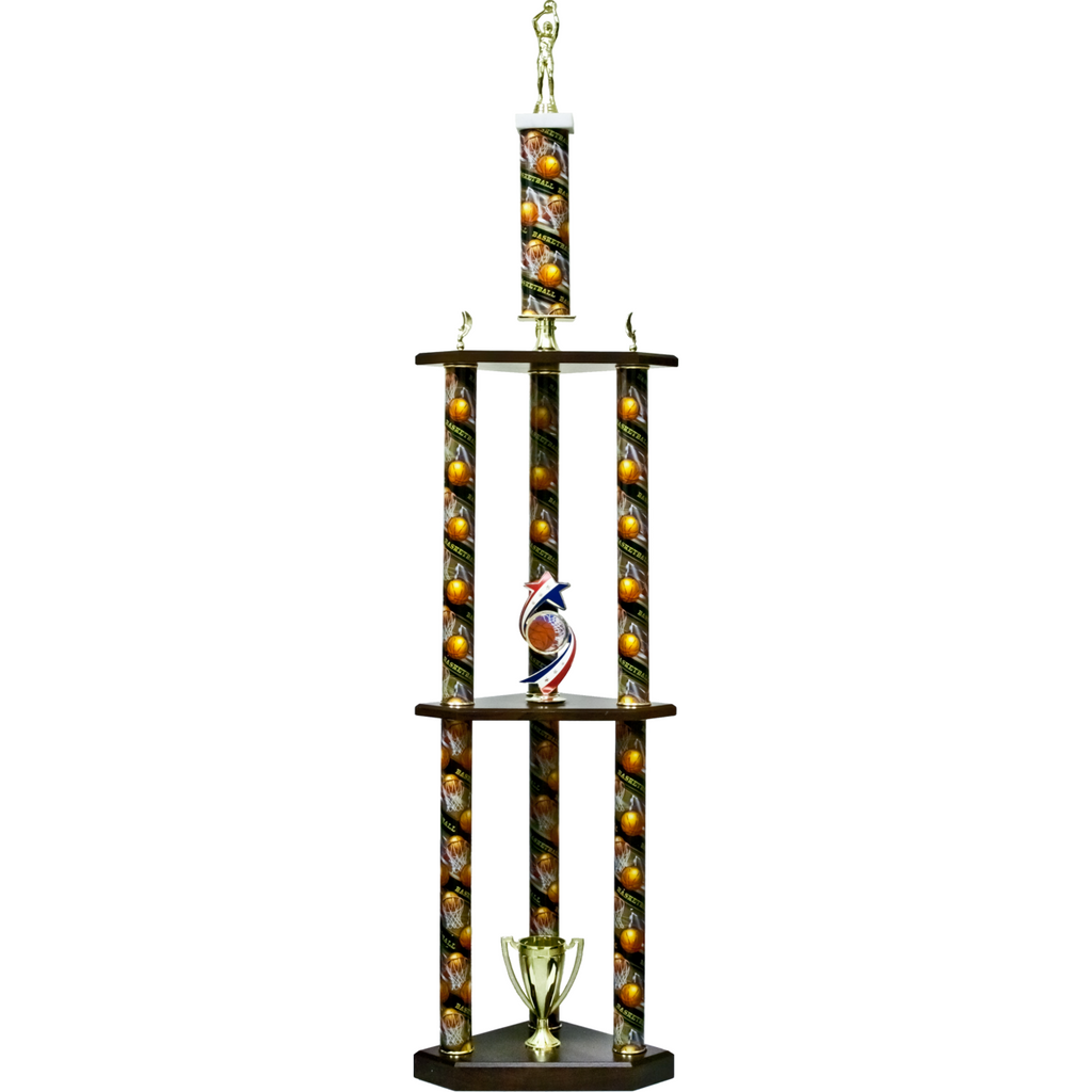 Traditional Series Three-Tier 3 Post Trophy with "Exclusive" Olympic Star activity insert figurine. Stands 56" tall! Select from your choice of column color designs, colorful activity inserts, and from our wide array of figures with complimenting trim choices below.
