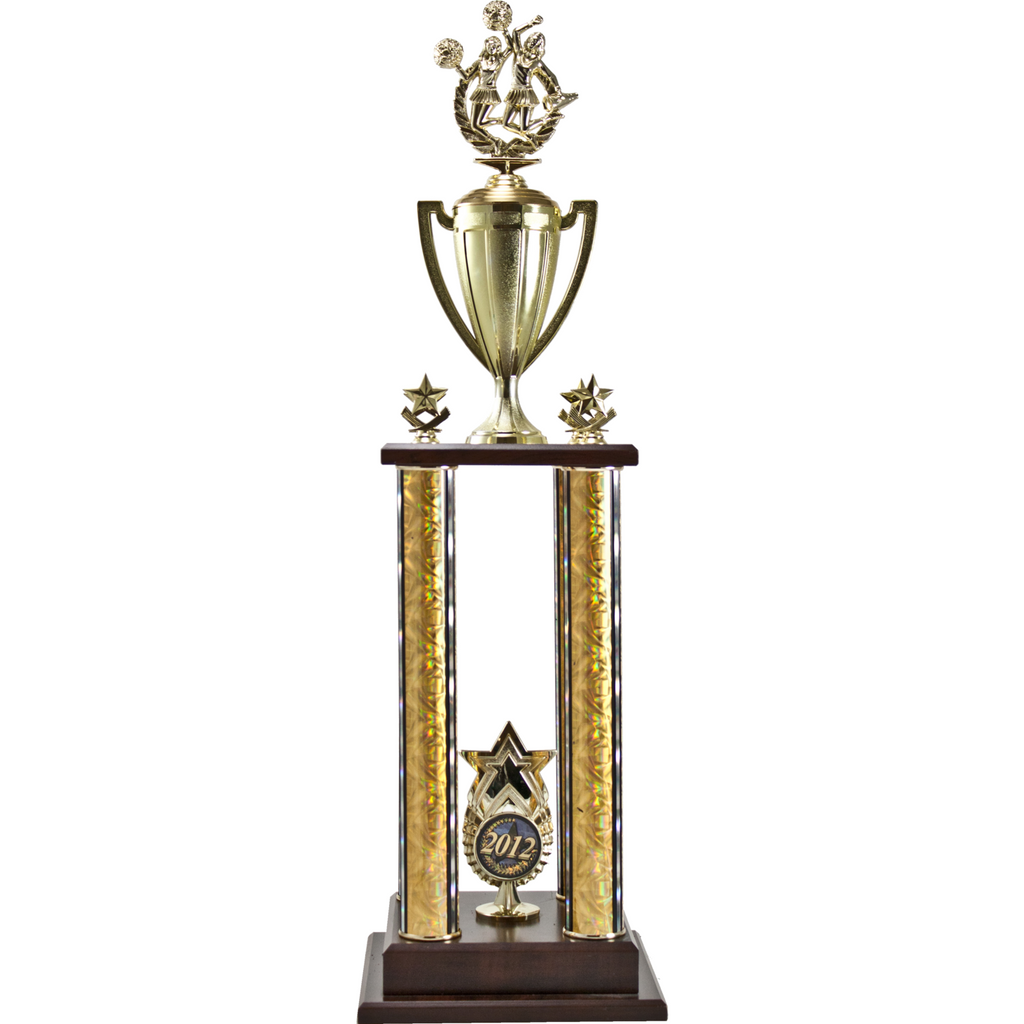 Traditional Series Two-Tier 4 Post Trophy with Star "Exclusive" Star activity insert holder figure & Trim figurines. Select from your choice of column color designs, colorful activity inserts and from our wide array of figures with complimenting trim choices below. Featuring our "Exclusive" Star activity insert holder figure - A unique twist to a Classic! Gold-tone personalization plate is applied to the walnut veneer base.