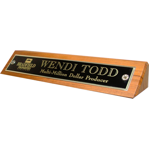 Recognition can mean many things. Solid walnut with two-tone gold plates that hold your name and/or title. It can be one color imprint as shown for an elegant office environment or printed in full-color for total corporate recognition.Â